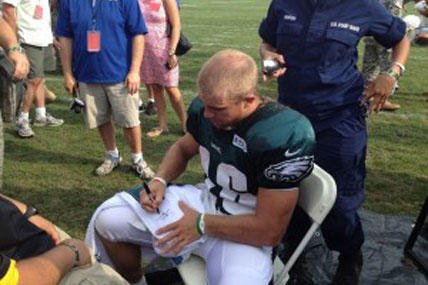 After practice ended, members of the military joined Eagles backup quarterback Trent Edwards, guard Evan Mathis and several other players in shaving Hall's head.