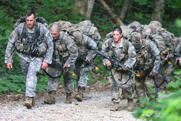 Ranger candidates, burdened with heavy packs and weapons, hike up a trail during the Mountain Phase of the traditionally all-male infantry course. (Army Photo)