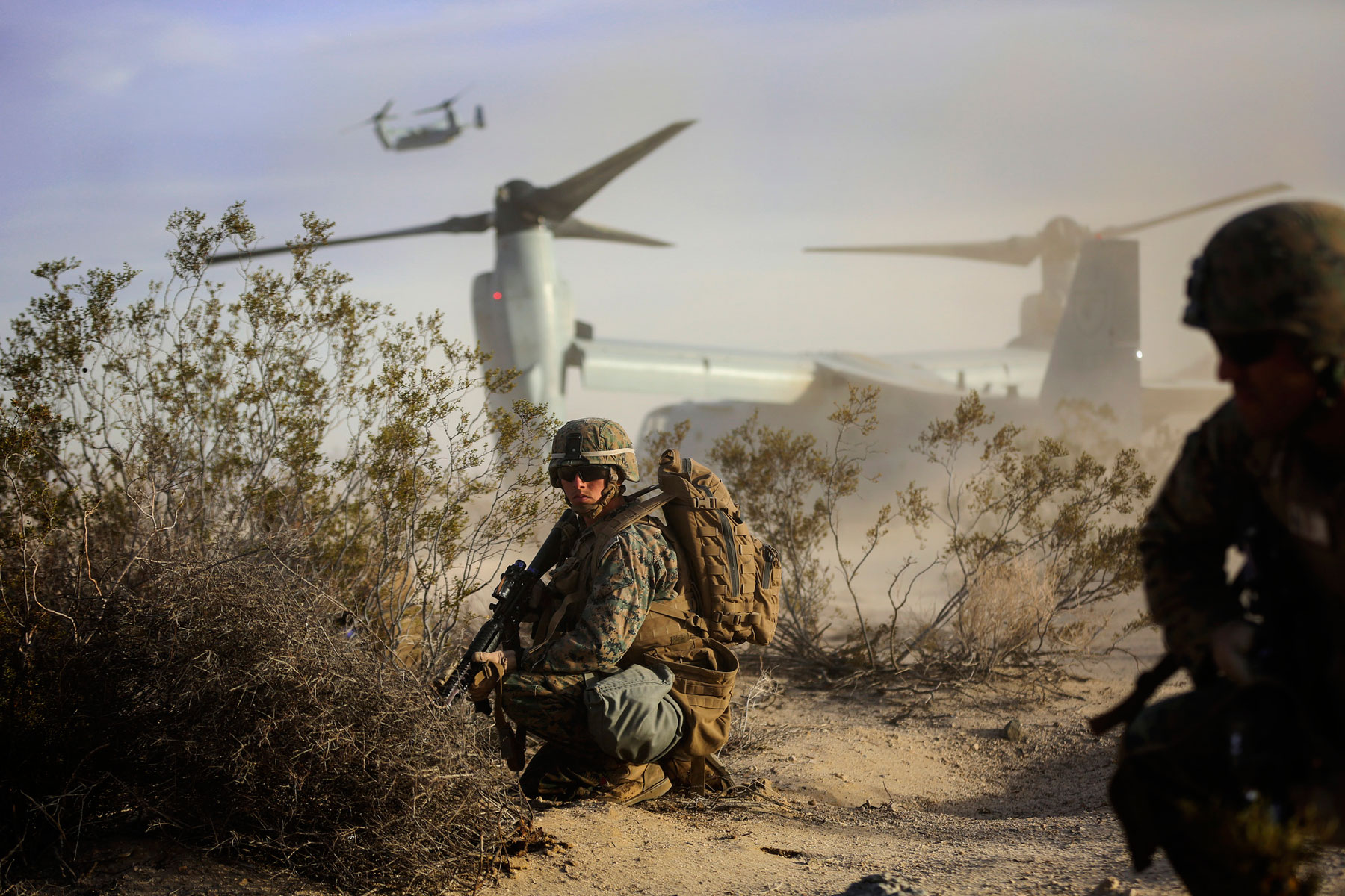 Cpl. Paul Regotti, a squad leader with 3rd Battalion, 7th Marine Regiment, provides security for Marines exiting an MV-22 Osprey during an air assault on a Military Operation on Urbanized Terrain town. The training was part of the Marine Corps' Combat Readiness Evaluation Exercise, Jan. 16, 2015. (U.S. Marine Corps photo/Julio McGraw)