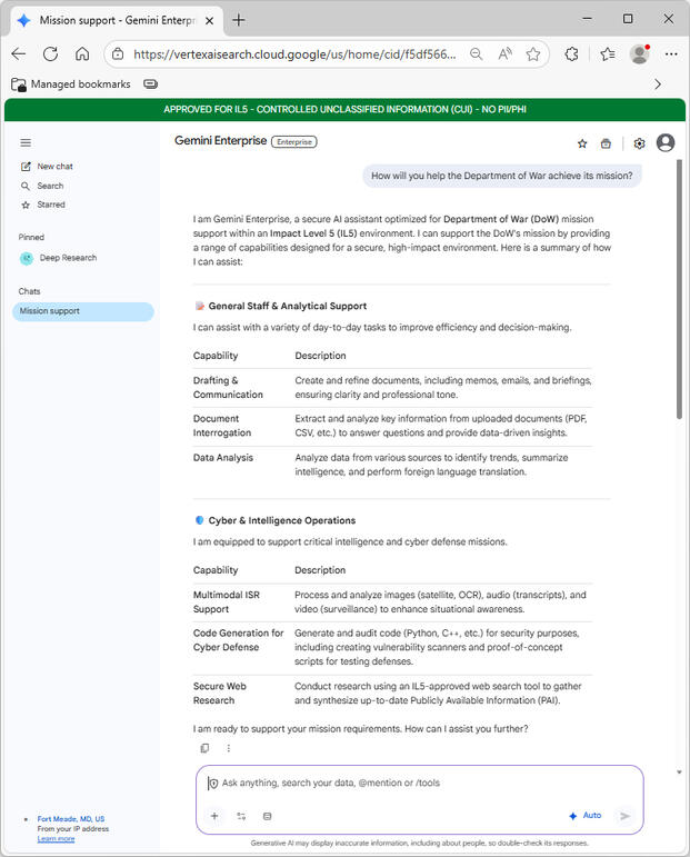 Also on Tuesday, Defense Secretary Pete Hegseth and his department announced that DoD employees began using GenAI.mil, a secure generative AI platform for every department member that is described as a specialized version of the Google AI tool Gemini called “Gemini for Government.”