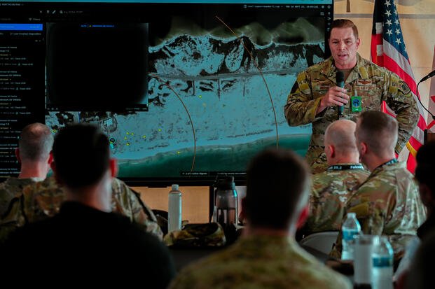 Military leaders demonstrate engagement of a containerized open Counter UAS system, known as a Fly Away Kit, built to detect, track and intercept unmanned aircraft and autonomous drone systems during Falcon Peak 25.2, the North American Aerospace Defense Command (NORAD) and U.S. Northern Command (USNORTHCOM) experimentation event at Eglin Air Force Base, Florida, on September 18, 2025. (DOD Photo by Devon Bistarkey).