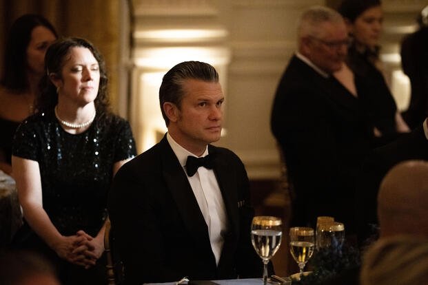 Defense Secretary Pete Hegseth attends the National Governors Association dinner at the White House, Saturday, Feb. 21, 2026, in Washington. (AP Photo/Allison Robbert)