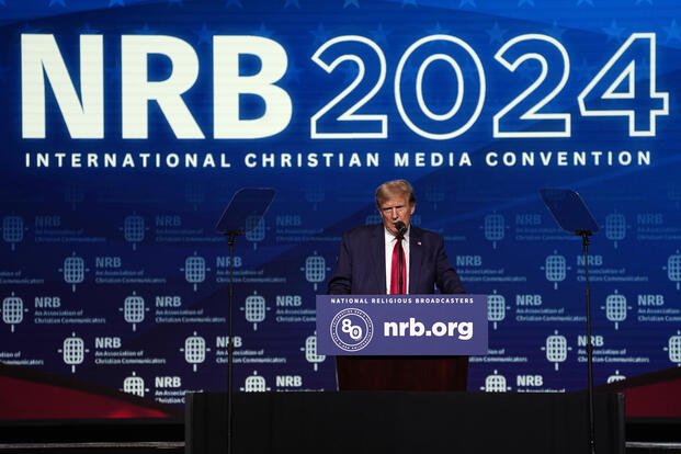 Republican presidential candidate former President Donald Trump speaks at the National Religious Broadcasters convention at the Gaylord Opryland Resort and Convention Center Thursday, Feb. 22, 2024, in Nashville, Tenn. (AP Photo/George Walker IV)