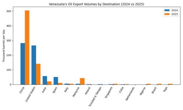 The data essentially shows less oil for the U.S. and more for China, the latter of whose purchases nearly doubled while U.S.-bound barrels dropped sharply. Malaysia also saw a jump, which analysts said signals ownership chains and ship-to-ship transfers that make cargo harder to trace.