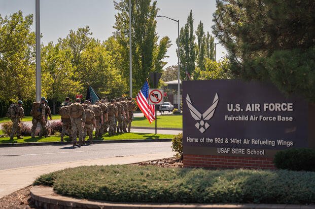 U.S. Air Force Airmen with the 66th Training Squadron’s Pre-Team 26-02 carry the American and POW/MIA flags during the annual POW/MIA memorial ruck march through Fairchild Air Force Base’s main gate during a memorial ruck march, Sep. 19, 2025. (U.S. Air Force photo by Senior Airman Stephanie Orta Carranza)