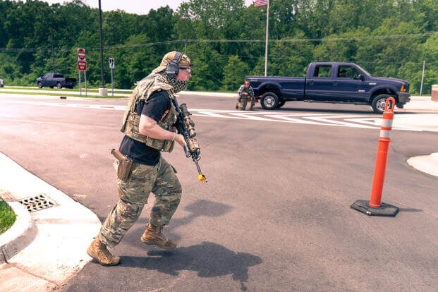 Service members from 110th Wing Security Forces Squadron conduct a gate breach scenario during the Wing’s Operational Readiness Exercise on June 6, 2025, at the Battle Creek Air National Guard Base, Michigan. (U.S. Air National Guard photo by Staff Sergeant Ryan Bishop)