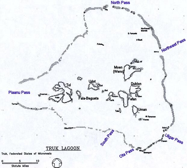 Truk Lagoon sits roughly 1,000 miles northeast of New Guinea in the western Pacific. A massive barrier reef some 40 miles across encircles dozens of volcanic islands. Japan seized the atoll from Germany during World War I and held it under a League of Nations mandate.