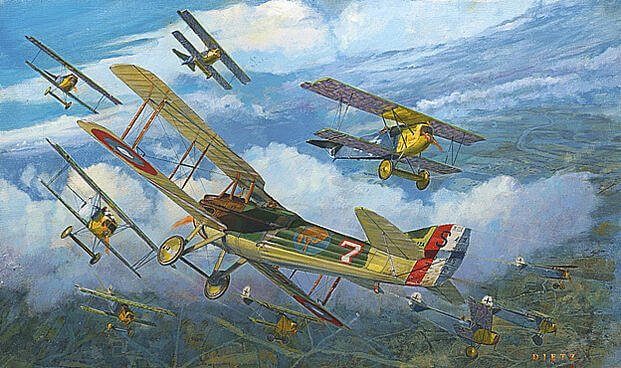 As they flew north along the Meuse River, the two pilots spotted a German Hannover observation plane and dove after it. Focused on their target, neither initially saw the nine Fokker D.VII fighters from Jasta 19 lurking in the clouds above, flying in two formations of four and five aircraft.