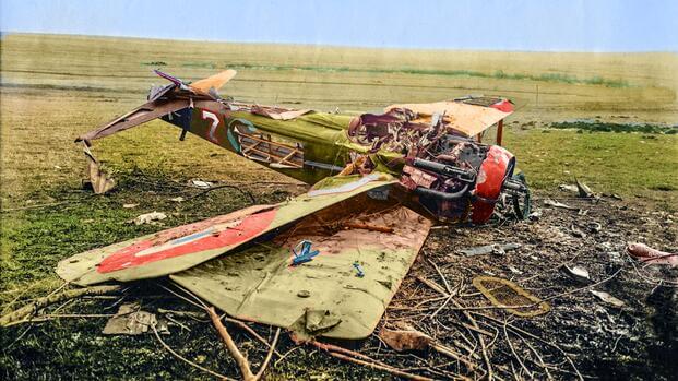 The impact slammed his face into the leather-covered wooden dashboard, crushing his forehead into shards. The wooden propeller clipped the ground, splintered and flipped the plane onto its back, collapsing the wings and wrapping support wires around his neck.