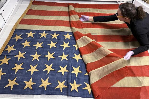 Museum Specialist Megan Hunter unfolds the 34-star flag in the museum's collection kept in flat storage April 17, 2025, at the Frontier Army Museum at Fort Leavenworth, Kansas. (Photo by Stephanie Mahone/Fort Leavenworth Garrison Public Affairs Office)
