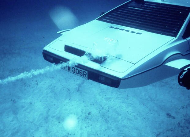 One of the series’ most iconic gadgets, the Lotus Esprit “Wet Nellie,” dives beneath the waves in The Spy Who Loved Me (1977). Photo credit: MGM / Eon Productions