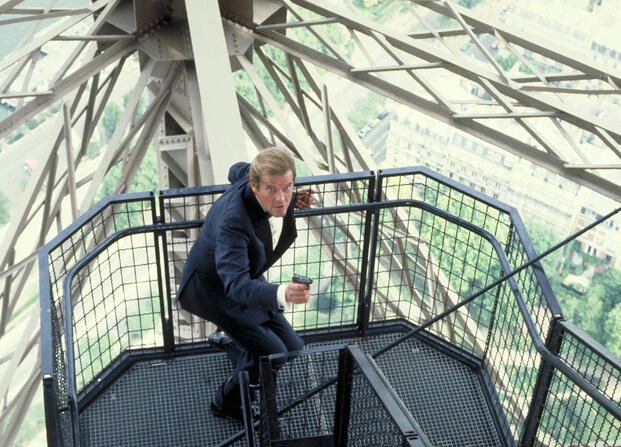 Roger Moore’s final turn as 007 opens with a daring Eiffel Tower chase in A View to a Kill (1985). Photo credit: MGM / Eon Productions