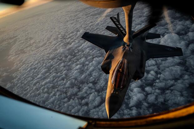 A U.S. Air Force KC-135 Stratotanker aircraft refuels a U.S. Air Force F-35A Lightning II aircraft during Operation Epic Fury in the U.S. Central Command area of responsibility April 5, 2026. US Air Force photo. Source: DVIDS.