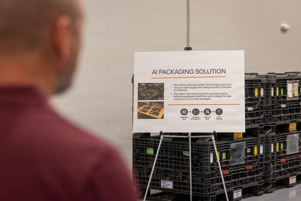 An Artificial Intelligence Solution sign is displayed during a tour of the new Individual Issue Facility on Marine Corps Base Camp Lejeune, North Carolina, April 14, 2026. (U.S. Marine Corps photo by Lance Cpl. DeCrane)