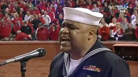 Retired Naval Petty Officer, 1st Class, Generald Wilson sings "God Bless America" during the seventh-inning stretch of Game 3 in