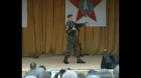 Russian soldier river dancing, electronic style. This guy's hoarding all the good Vodka in Russia and he knows it.