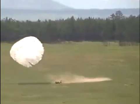 A Russian recruit has a nightmare of a parachute landing during a training exercise. Must have been an extremely windy