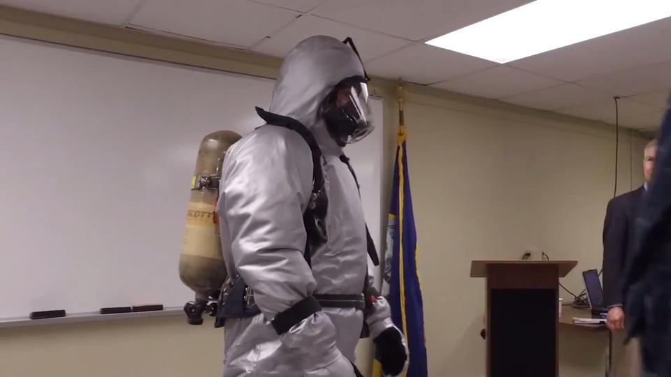 Sailors from the Los Angeles class-attack submarine USS Toledo (SSN 769) try out a prototype submarine steam suit ensemble during