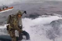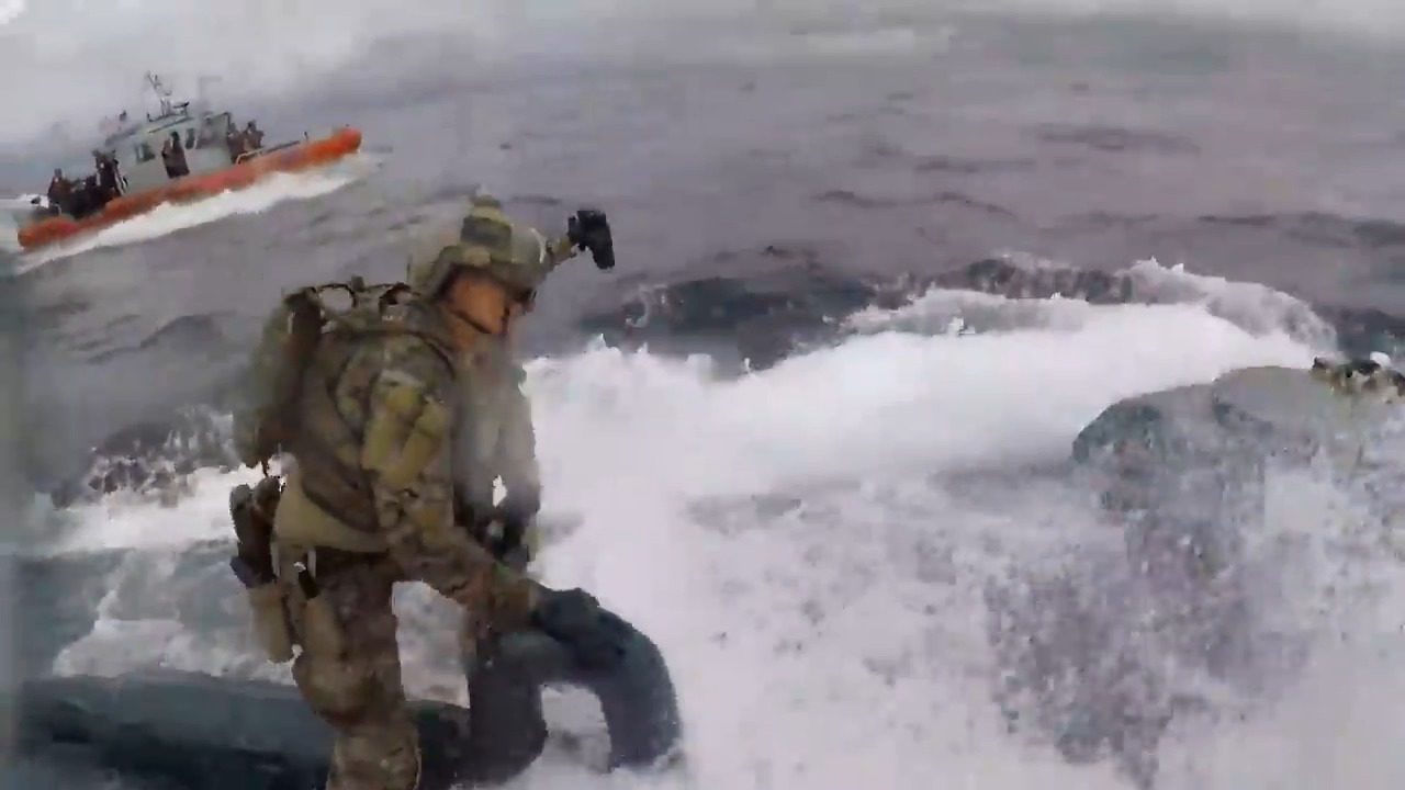 U.S. Coast Guard Cutter Munro (WMSL 755) crew members board a self-propelled semi-submersible suspected drug smuggling vessel (SPSS) June 18