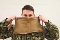 Mass Communication Specialist 2nd Class Tyler Fraser demonstrates do it yourself facemask options per Centers for Disease Control and Prevention