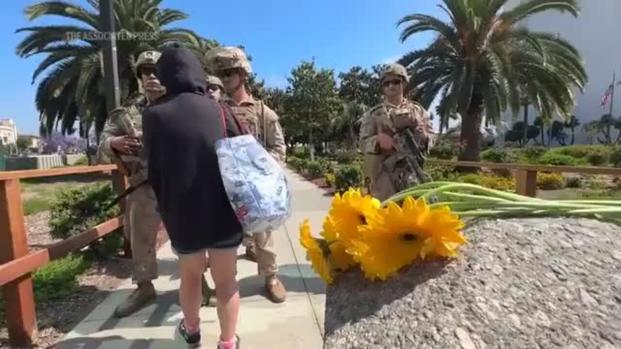 U.S. Marines stationed in Los Angeles stopped a woman wearing a hooded jacket from crossing a bridge on Friday. (Jun. 16) AP