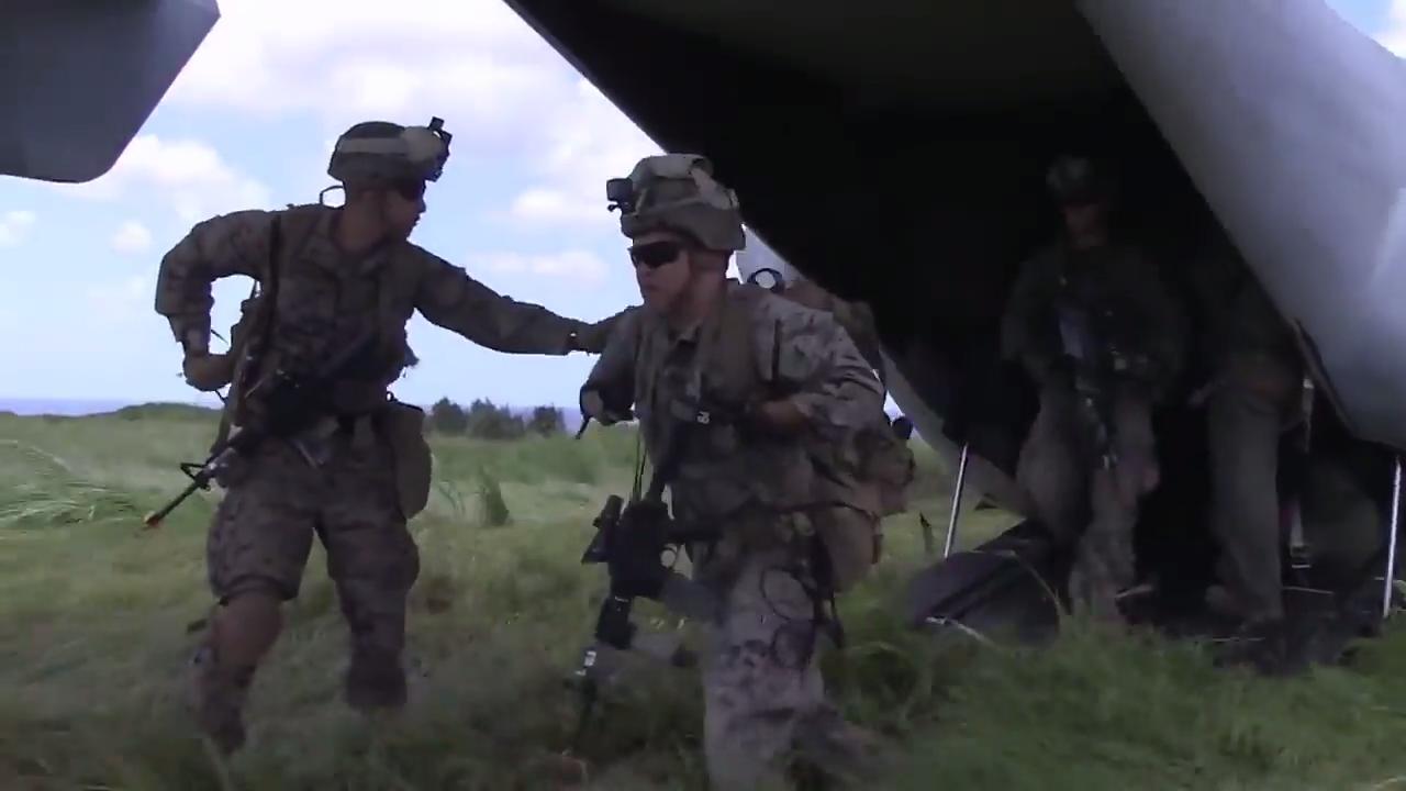 Marines with Company E, Battalion Landing Team, 2nd Battalion, 4th Marine Regiment, are inserted by MV-22 Osprey on Ie Shima