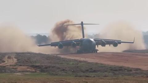 An U.S. Air Force C-17 Globemaster III lands at Fort Bragg, North Carolina, and unloads two AH-64 Apache helicopters. Following