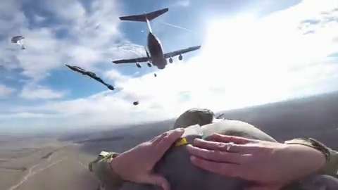 Members of the U.S. Army's 82nd Airborne Division jump from C-17 Globemaster III transport planes near Zaragoza, Spain during NATO