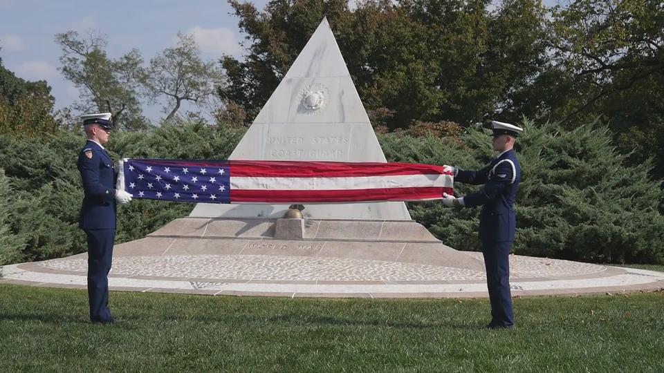The USCG Ceremonial Honor Guard demonstrates a proper two-man flag fold.