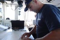 Petty Officer 2nd Class John Gross, a navigator of the watch aboard the Coast Guard Cutter Spencer, ensures the safe