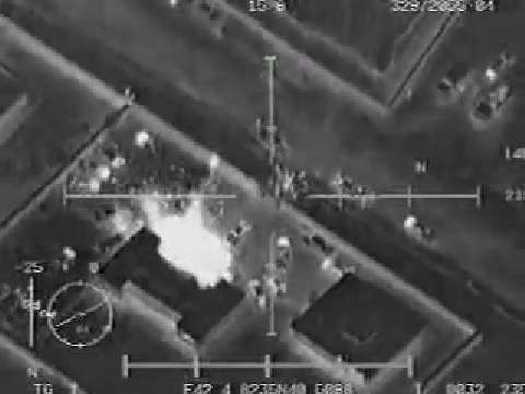Apache gunship engages 10 insurgents with a Hellfire missle in Iraq.