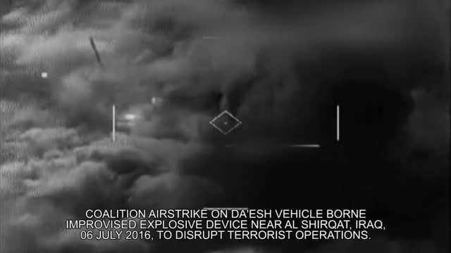 Coalition airstrike on Da’esh vehicle borne improvised explosive device near Al Shirqat, Iraq, to disrupt terrorist operations. The strikes were