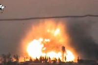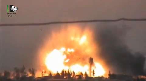 Syrian rebels film an IED attack on a Syrian Army ammunition truck. A massive explosion incinerates the truck.