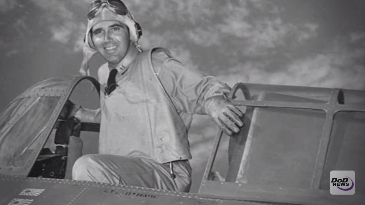 Navy Lt. Cmdr. Edward “Butch” O’Hare’s derring-do with his Grumman F4F-3 Wildcat fighter plane’s .50-caliber machine guns blazing across the
