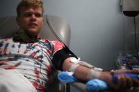 Hospitalman Nicholas Cool, a recovered COVID-19 patient, is the first convalescent donor to donate plasma at the Armed Services Blood