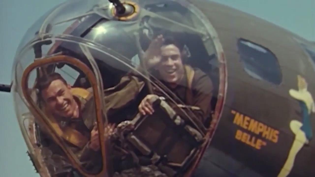 Historic color footage of the Memphis Belle B-17 bomber with her famous flight crew and other B-17s during WWII. (No