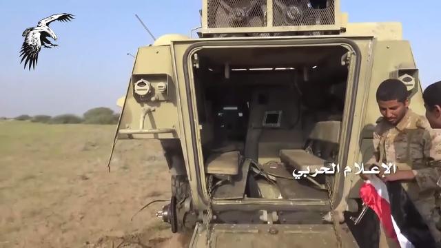 Houthi fighters show a captured Saudi "Pegaso BMR" 6x6 wheeled armored personnel carrier before they blow up the vehicle.