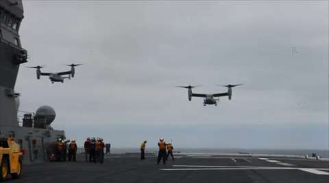MV-22B Osprey with Marine Medium Tiltrotor Squadron (VMM-161) landing aboard the JS Hyuga (DDG-181) for the first time as part