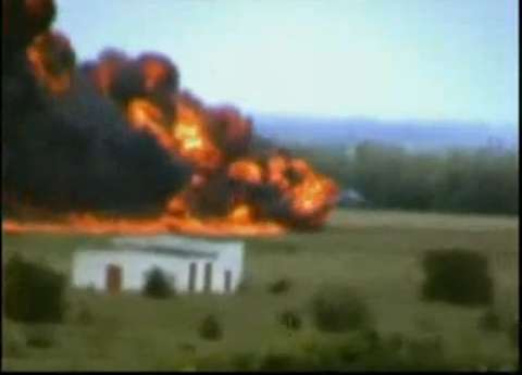 Sevastopol, Ukraine – A Russian TU-134 military passenger plane sucks in a flock of birds into the engine on takeoff
