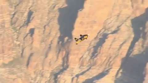 A Swiss adventurer has completed a flight over the Grand Canyon with his jet-propelled wing attached to his back. Yves