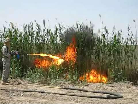 Mechanics take care of some bushes with a flamethrower in Iraq.