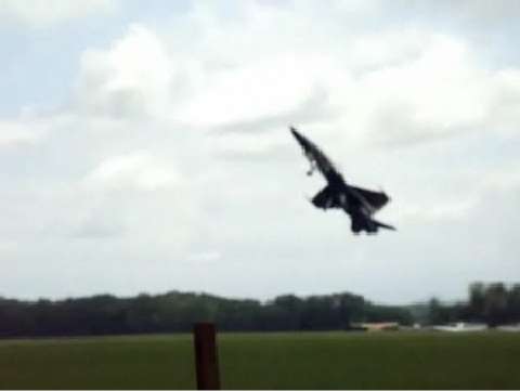 Canadian Forces CF-18 performs insane take-off and dirty roll. Aircraft has commemorative '100 years of flight' paint job. Footage is