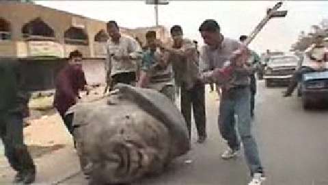After decapitating a statue of former Iraqi president Saddam Hussein, Iraqis dragged the statue's head through Baghdad, beating it as
