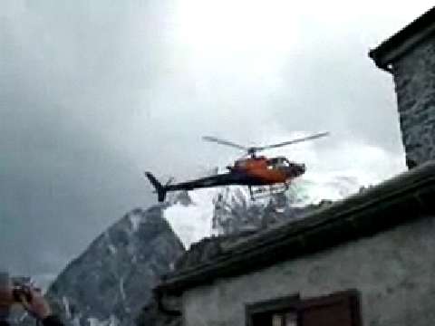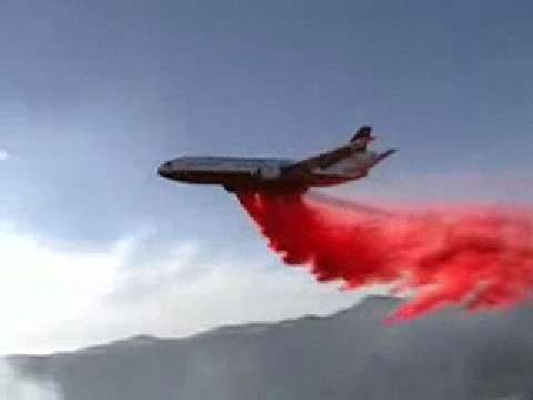 Firefighters film DC 10 fire retardant drop on mountain ridge.