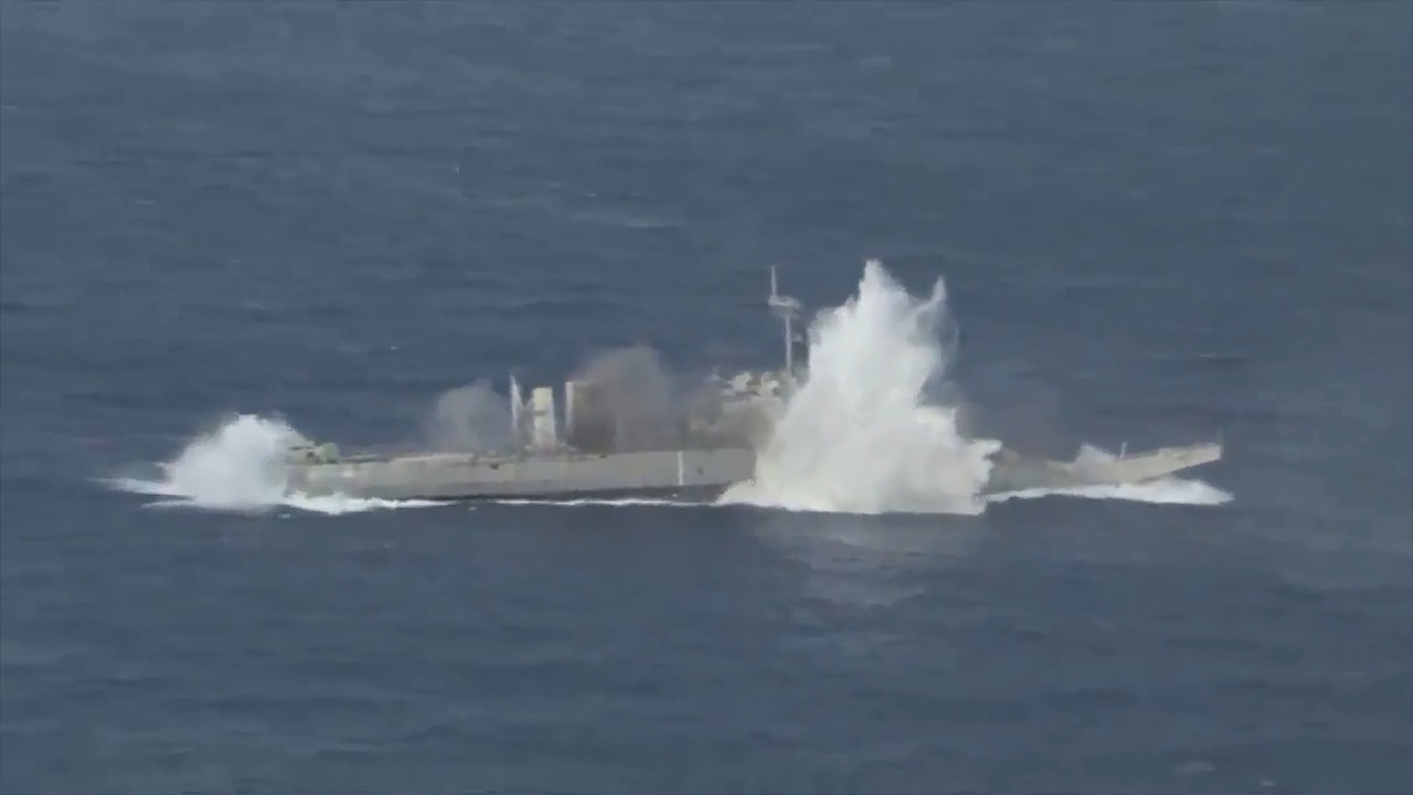 Live fire from aircraft, a submarine, and land assets sank ex-USS Racine during the Rim of the Pacific sinking exercise