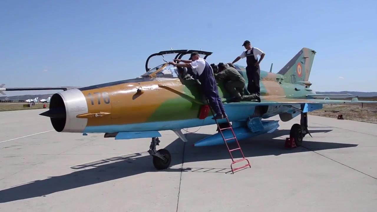 Romanian Air Force MIG-21 LanceR fighter jets takeoff at Camp Turzii, Romania during Operation Dacian Viper, training with the USAF