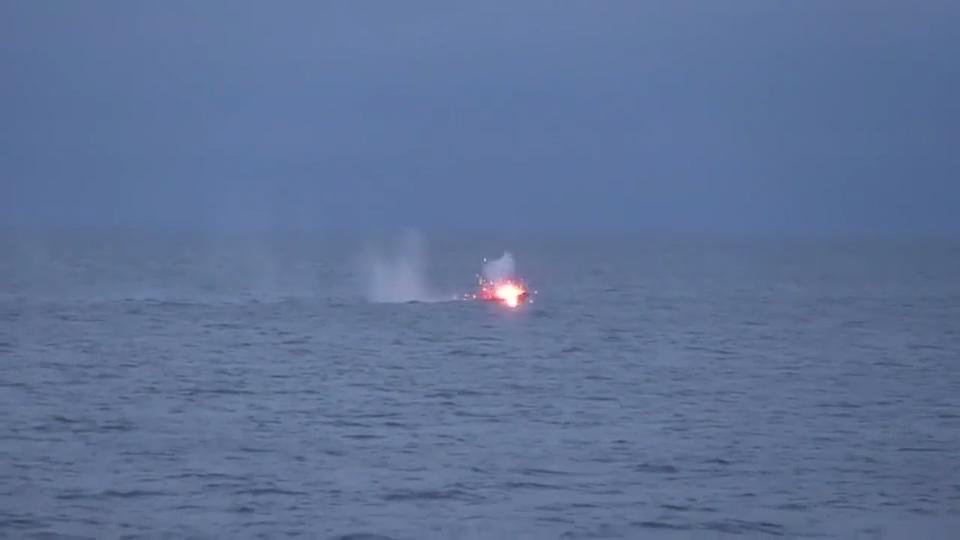 U.S. Navy weapons qualifications aboard the USS America (LHA-6). The Mark 38, Mod 2 30mm machine gun hits remote-controlled small