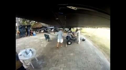 During a preflight inspection of an ultralight aircraft, one guy gets hit in the arm and the wrist by the