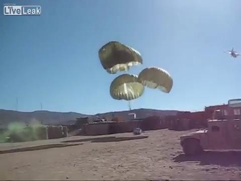 Blackwater resupplies a US Army combat outpost in Afghanistan. The last pallet landed in razor wire...3 of 4 is a