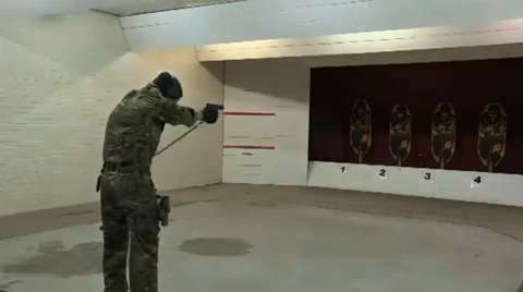 Sgt Steven Load, Royal Marine, firing the new Glock 17 pistol at the Royal Artillery Barracks, Woolwich. The MoD has